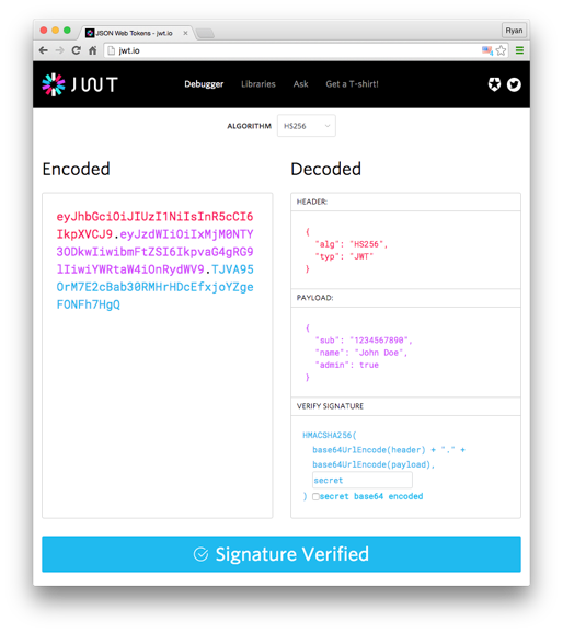 - JWT는 암호화(with the HMAC alsorithm) 을 사용하거나 public/private key pair 의 RSA or ECDSA 를 사용한다
